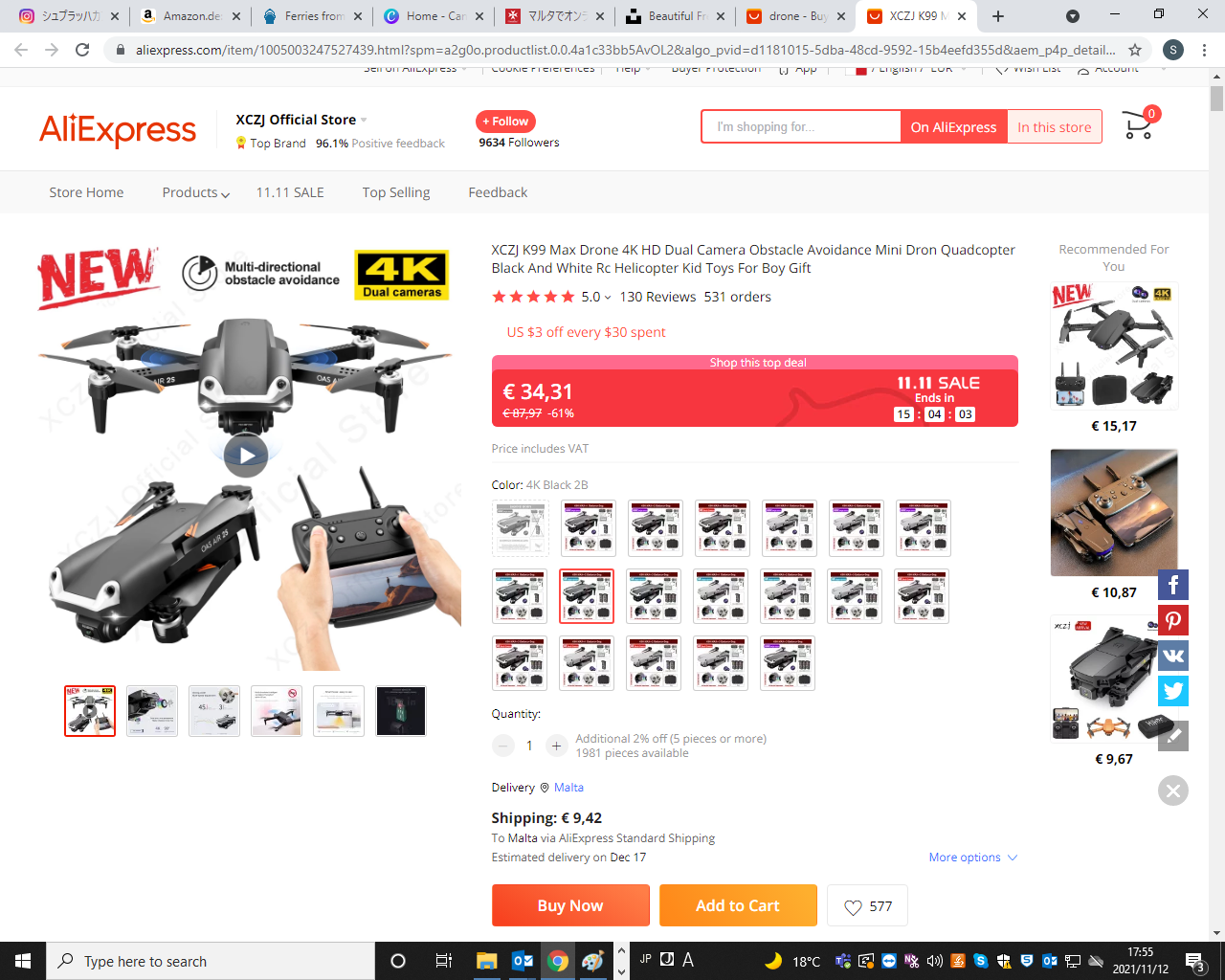 アリババエクスプレスでドローン調べると送料10€程でした、ドローン買おうかなぁ、、