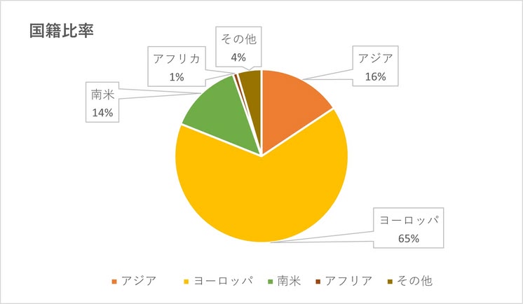 ヨーロッパ・アジア・南米・アフリカなど、世界中から集まっており、本当に多国籍です。シュプラッハカフェはドイツ発祥の語学学校なので、ヨーロッパからの生徒はもちろん、南米(コロンビア・チリ・アルゼンチン・ペルー・メキシコなど)から来る生徒も多く、普段日本にいるとなかなか出会えない文化や価値観に触れられるのが魅力です。