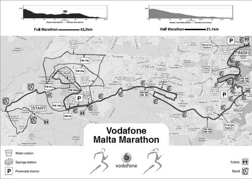 コースは、古都イムディーナをスタートして標高差200メートルを下った海抜0メートルの美しい港町スリーマのフェリーターミナルにゴールする典型的なダウンヒルコース(片道コース)。 コース途中には数世紀に渡り水を運んだかつての水道橋や17世紀に騎士団長によって建てられたボルテ・ドゥ・ドム、ヨーロッパ第3位という大きなドーム教会を持つモスタの町などがあり、歴史と隣あわせに走る魅力的なマラソンコース(マルタ観光局ホームページより引用http://www.mtajapan.com/maltamarathonopening.html)となっています。